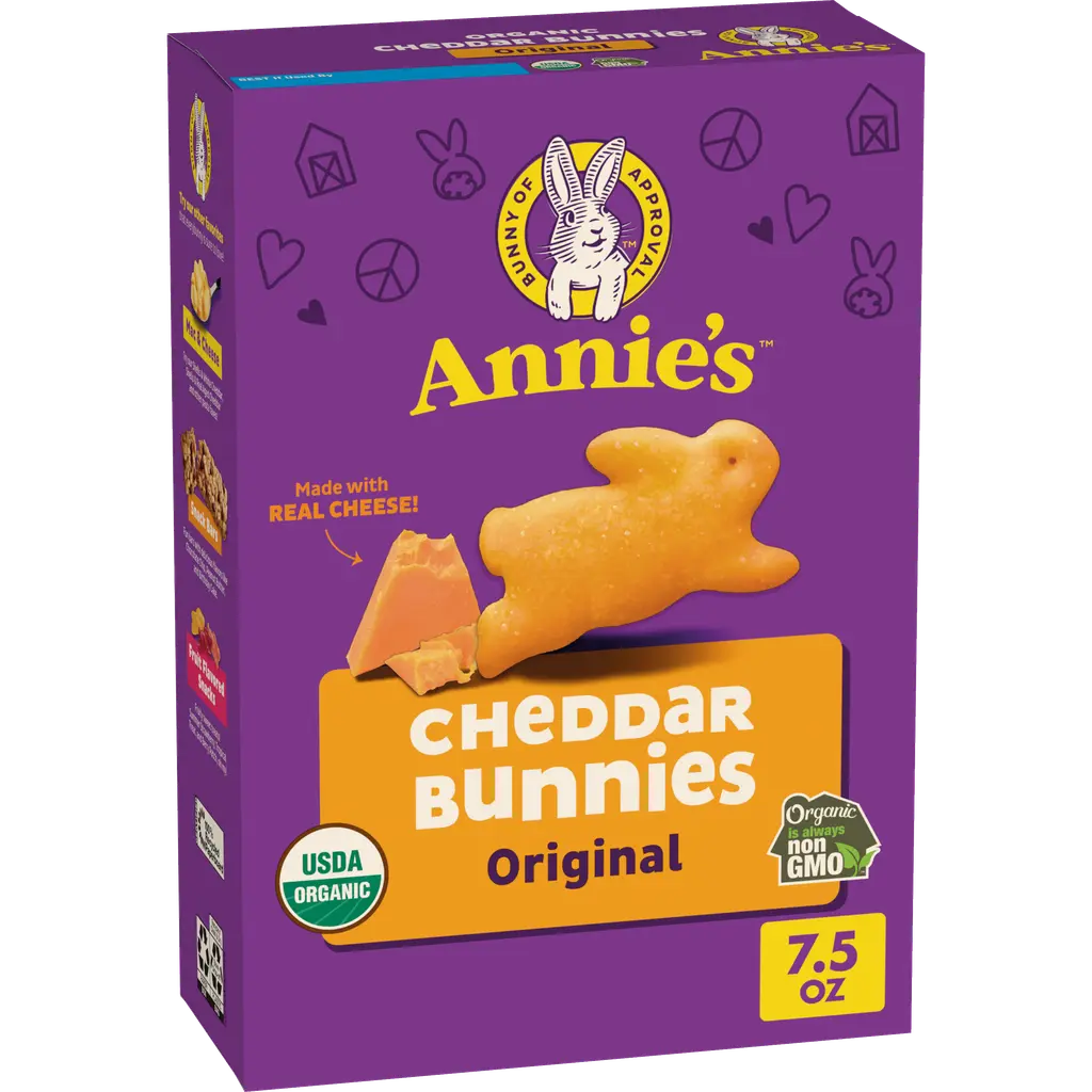 Cheesy, crunchy, and downright delicious—Annie’s Organic Cheddar Bunnies Baked Crackers are a snack-time favorite for kids and grown-ups alike.