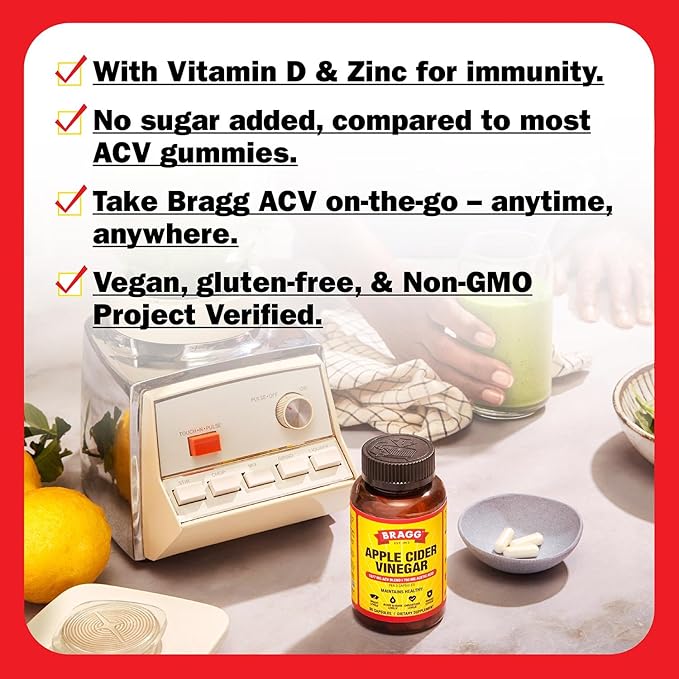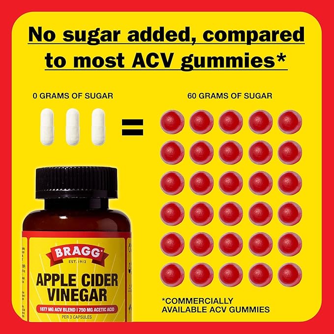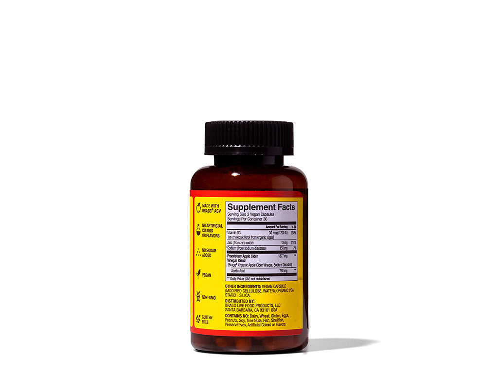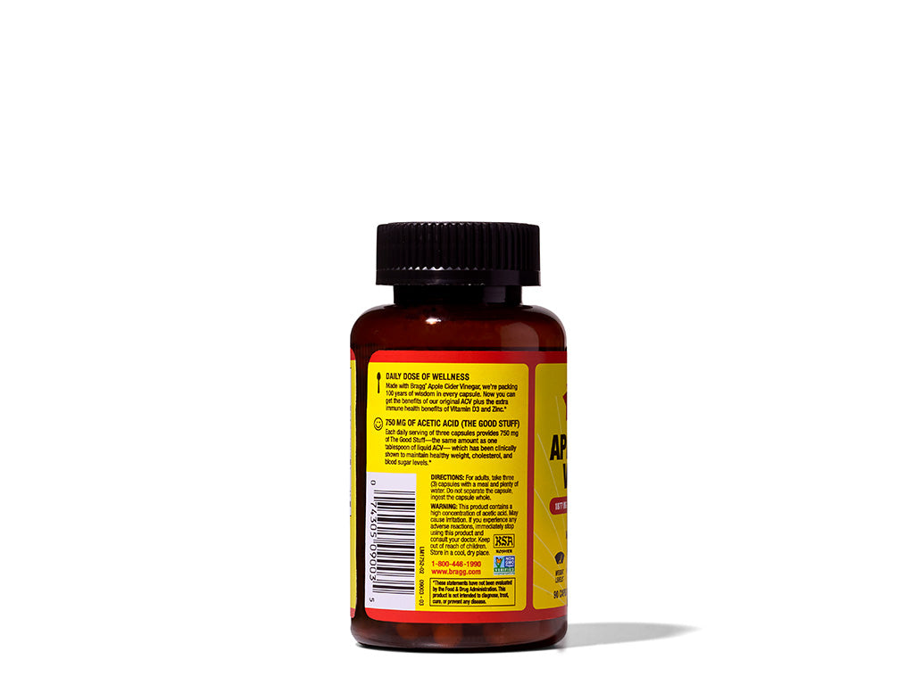 Level up your wellness with Bragg Apple Cider Vinegar Capsules! Packed with the original Bragg ACV, each capsule delivers 750 mg of Acetic Acid, plus Vitamin D and Zinc to support your health and keep you feeling your best. Fuel your body with the goodness it deserves—experience the power of Bragg ACV today!