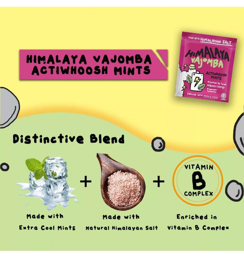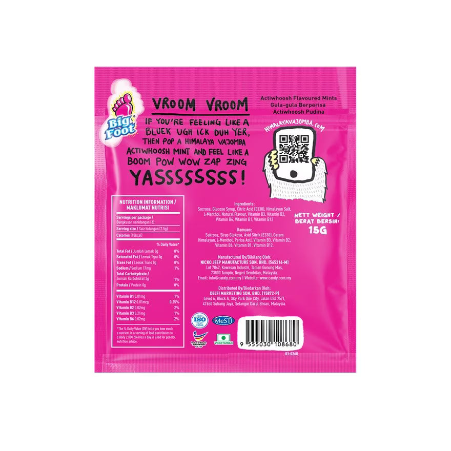 Experience a powerful burst of freshness with Big Foot Himalaya Vajomba Actiwhoosh Mints. Infused with the natural goodness of Himalayan salt, these mints combine cooling mint with a revitalizing zing that instantly refreshes your breath and awakens your senses.