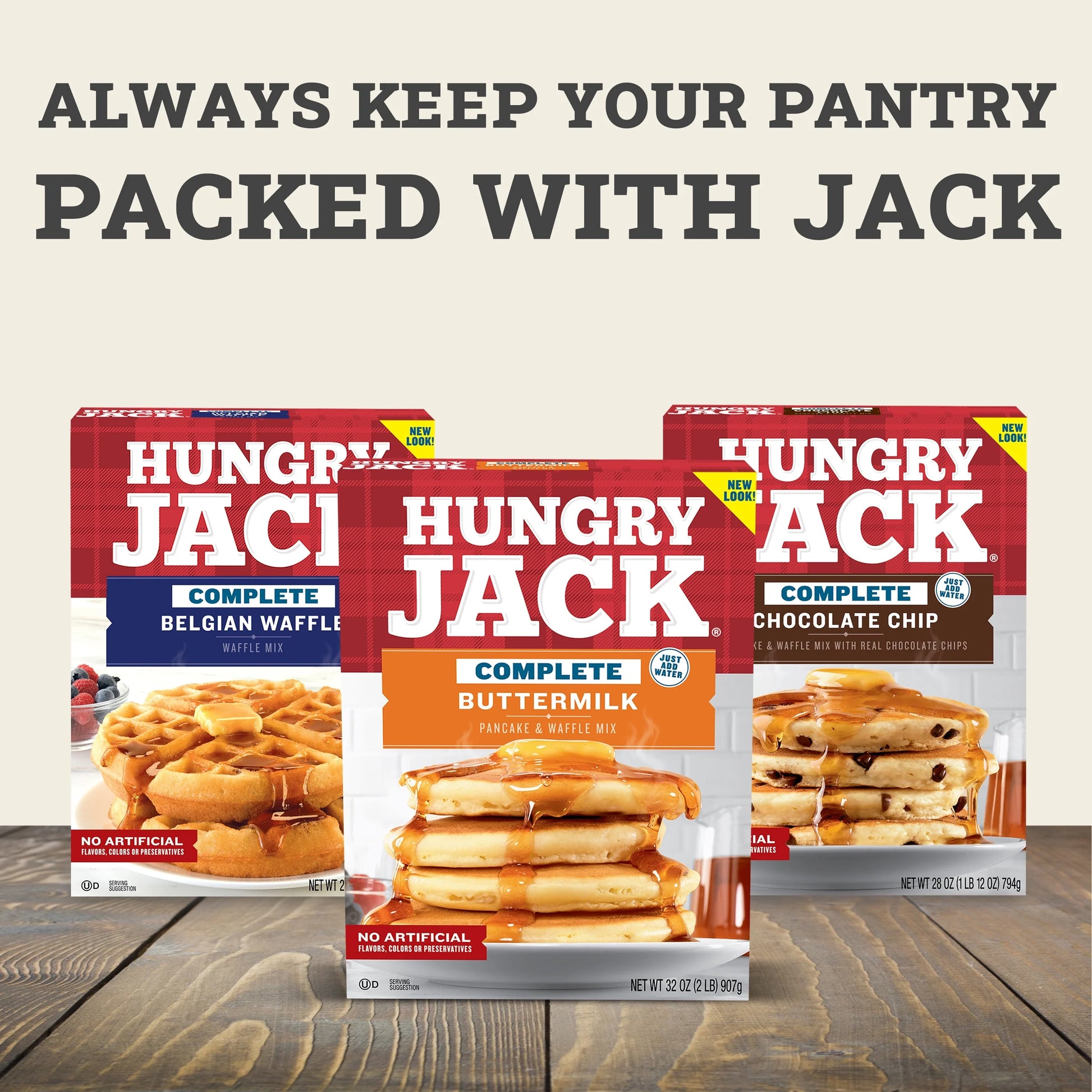 Make breakfast sweeter with Hungry Jack Complete Chocolate Chip Pancake & Waffle Mix. Packed with rich, melty chocolate chips, this hearty mix delivers fluffy pancakes and golden waffles with a touch of indulgence—all with the ease of just adding water.